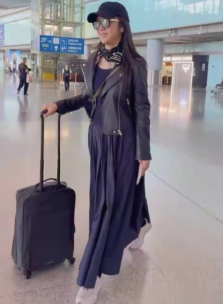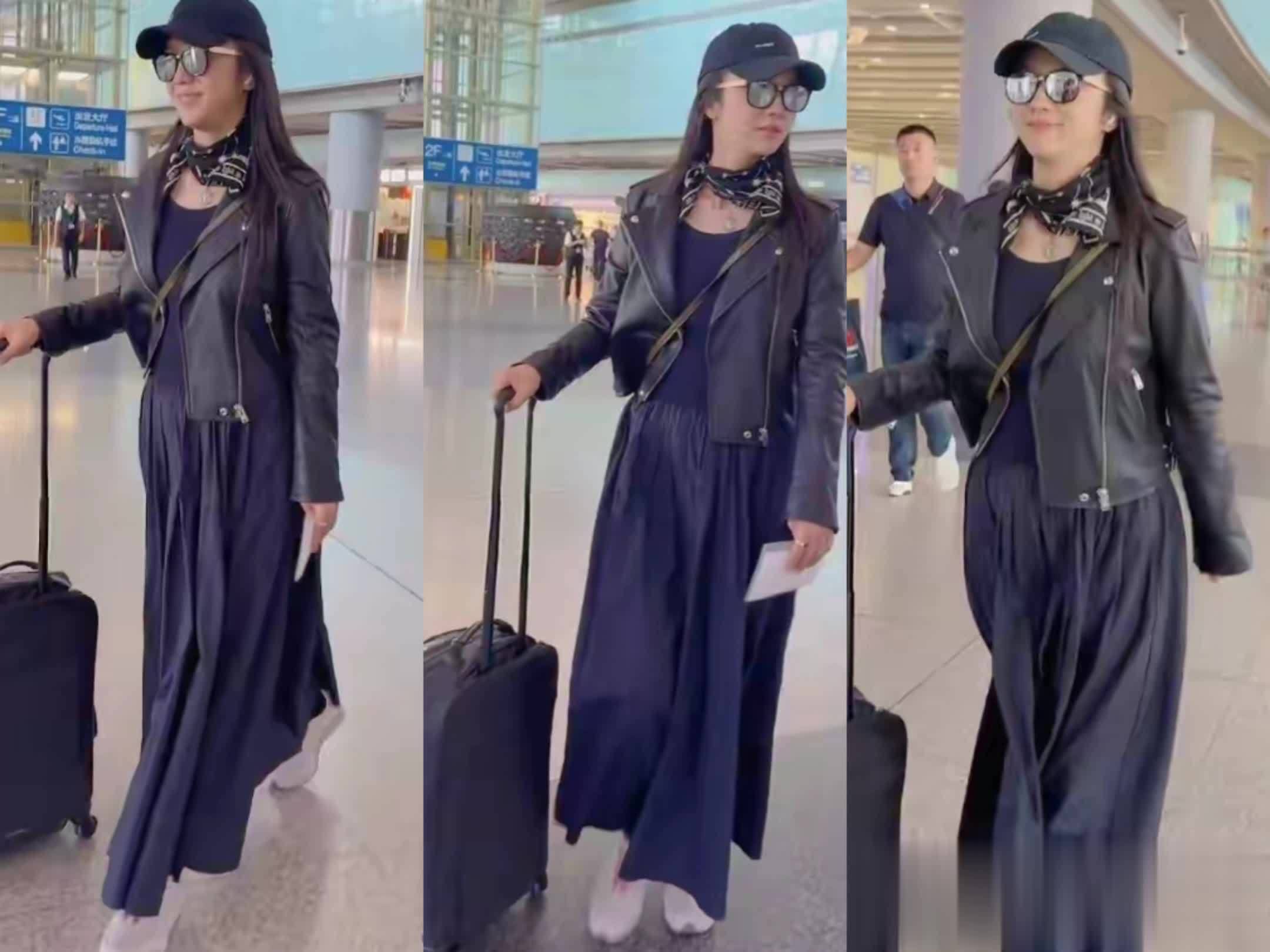 汤唯以黑色机车皮衣搭配黑色长裙,长度至脚面的黑色伞裙藏肉显瘦效果颇佳。颈间系上黑白印花丝巾,简约高级的风格便轻松打造出来。