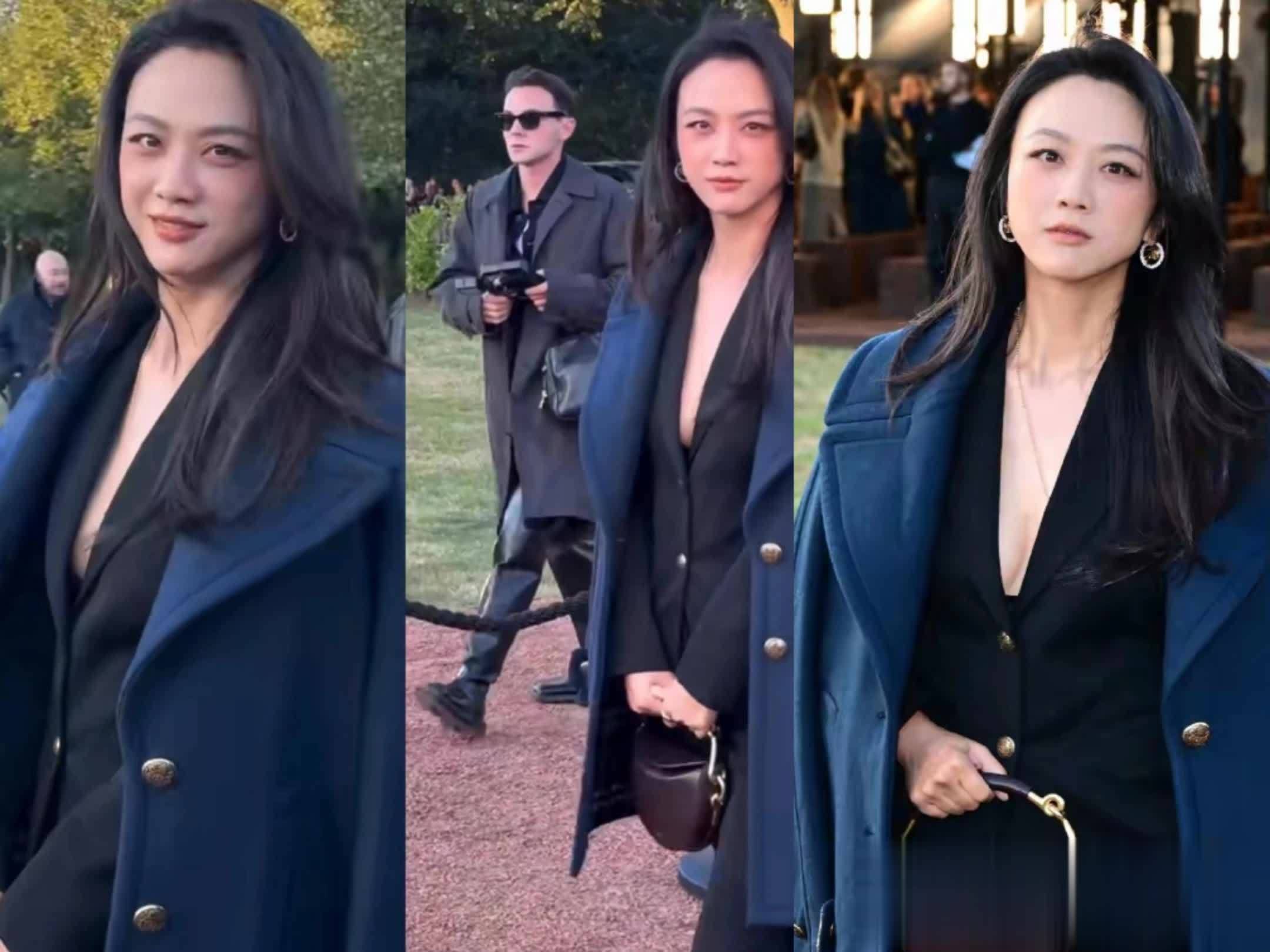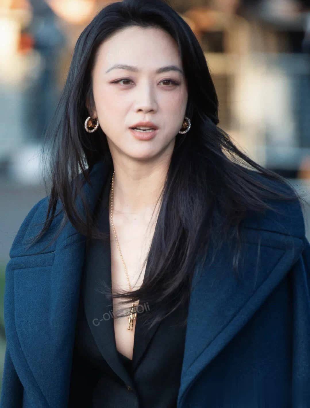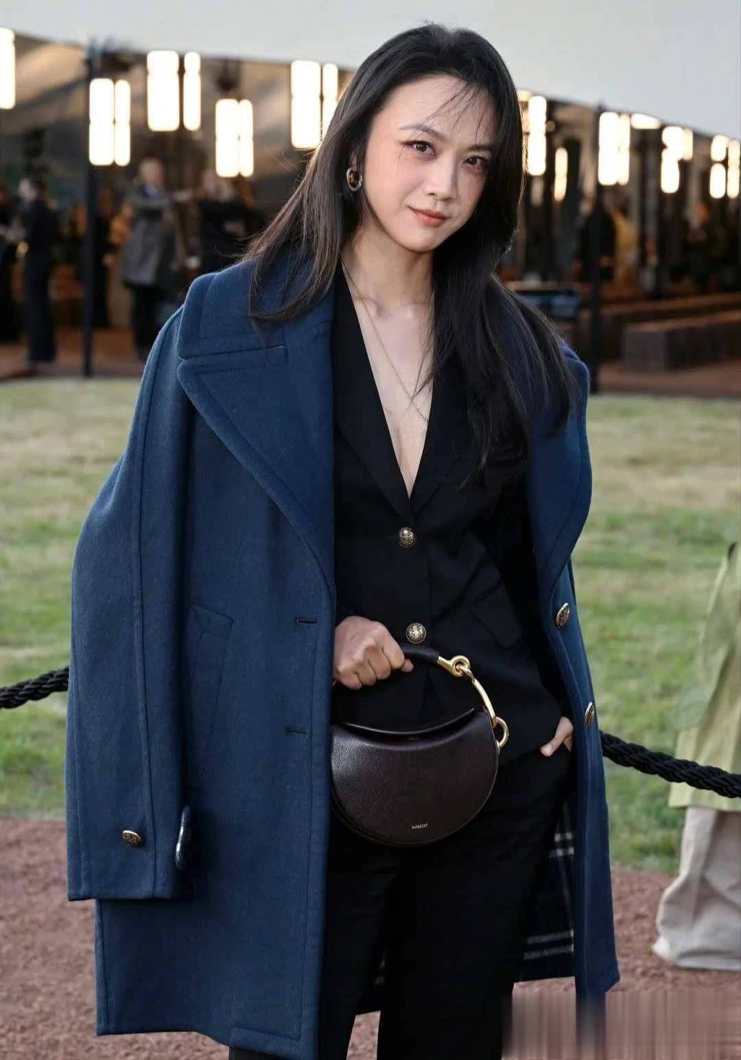 披着一件藏青色中长款大衣,御姐范十足。藏青色属于冷色系中的稳定色,兼具沉稳与神秘感,成熟女性往往能穿出其中的典雅与尊贵。